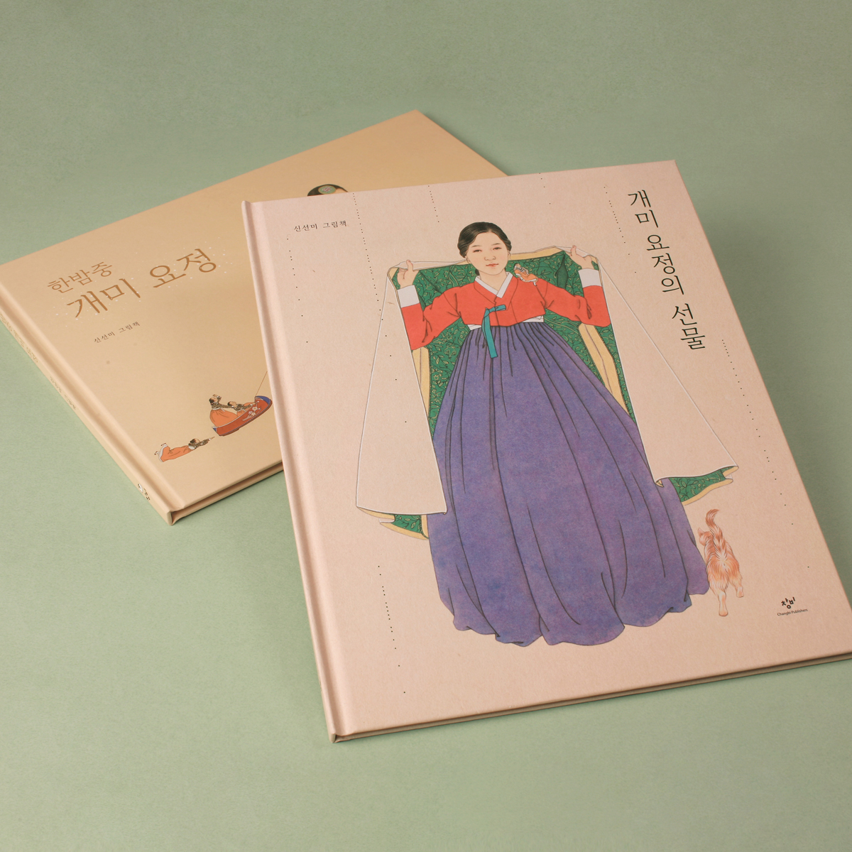 신선미 작가는 『개미 요정의 선물』 속 26점의 그림 모두 전통 채색화 기법으로 완성했다. 전통 채색화 기법은 매 단계마다 섬세하게 공을 들여야 하는 수고로운 작업이다. 먼저 장지에 색이 번지지 않도록 아교, 백반, 물을 섞어 바르고 말리기를 수차례 한 후에, 스케치한 종이를 장지에 덮어씌워 스케치를 눌러 베껴 낸다. 그다음 세필로 먹선을 긋고, 분채로 원하는 색이 나올 때까지 겹겹이 채색한다. 이렇게 수고로운 과정을 거쳐 정성스럽게 완성한 그림은 한 폭 한 폭이 더없이 아름다운 예술 작품이다. 특히 물들이듯 여러 번 색을 쌓아 올려 완성한 단아하고 깊이 있는 한복의 색감은 감탄을 자아낸다.