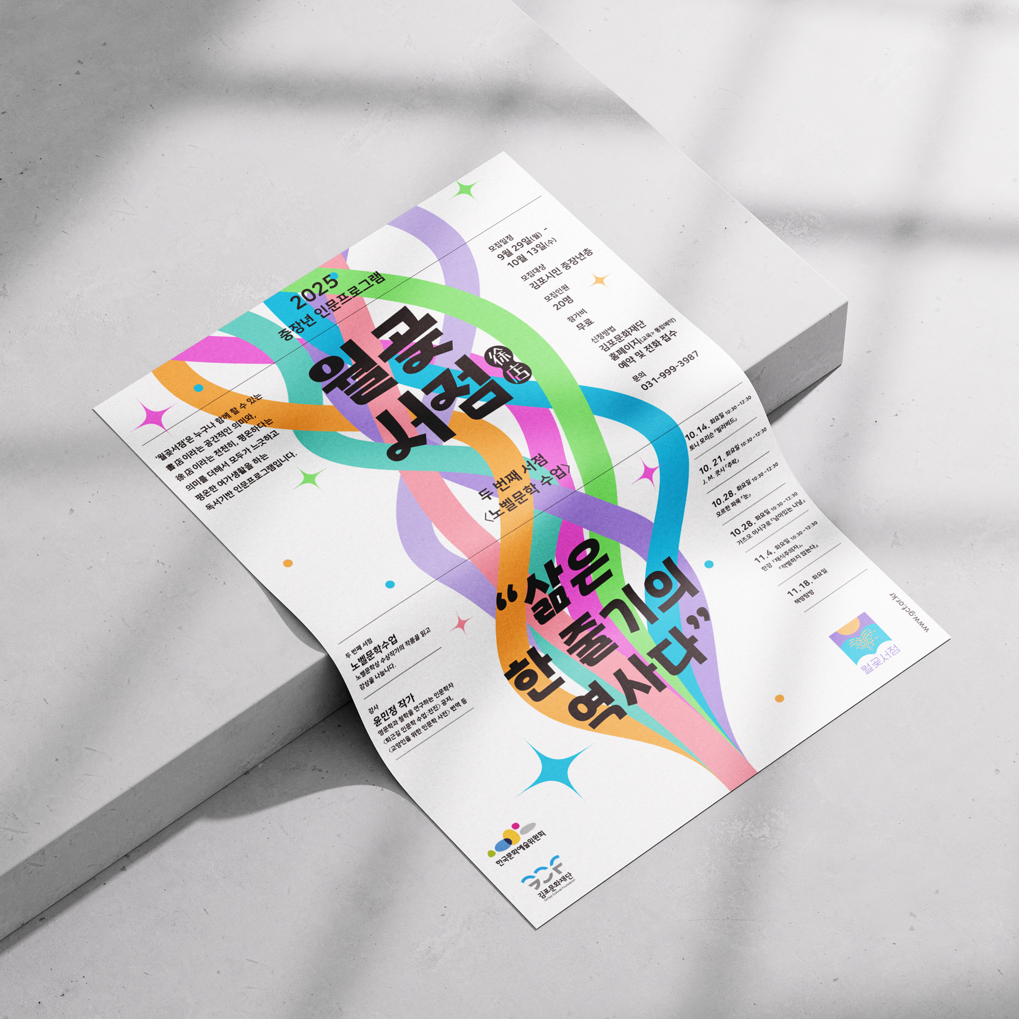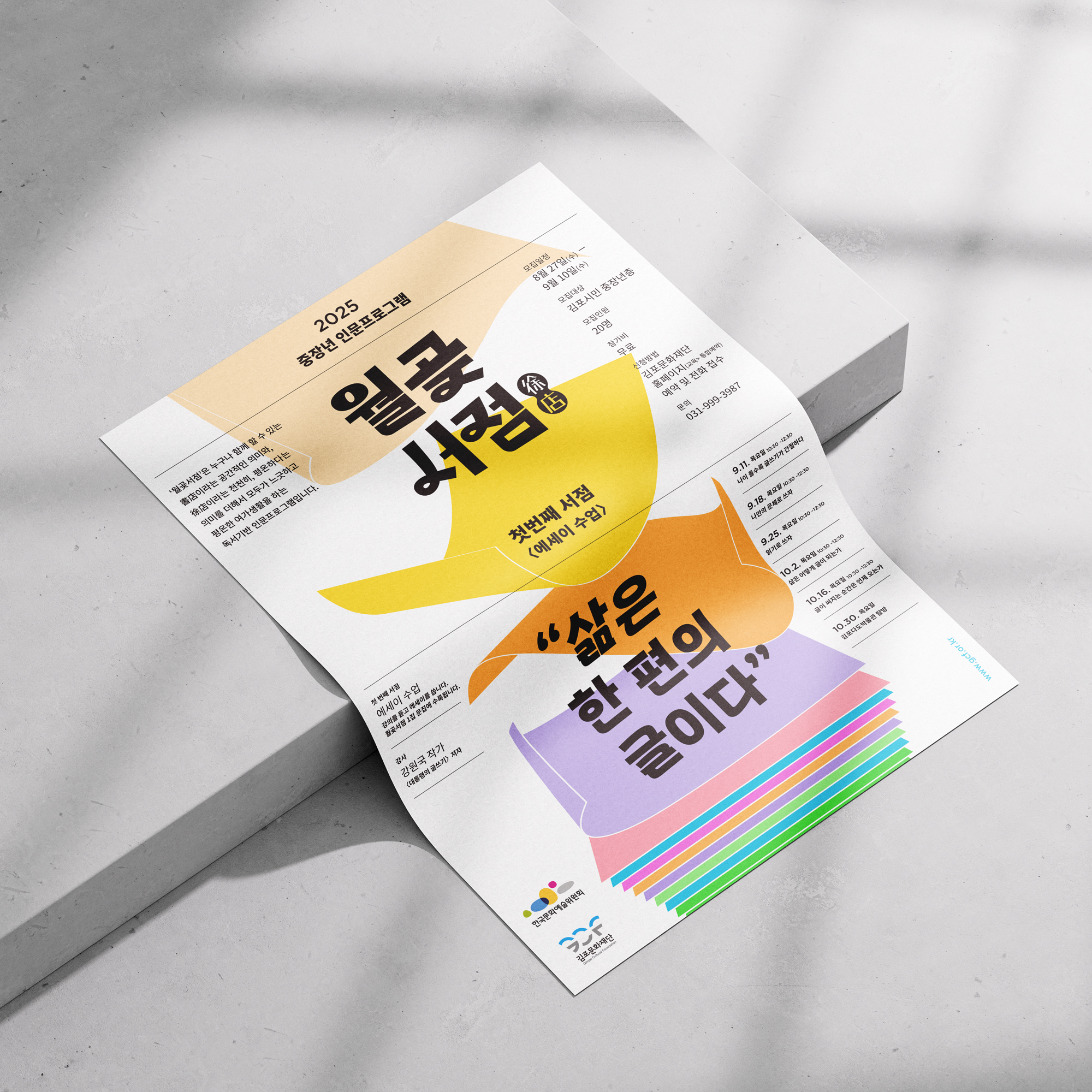 김포문화재단에서 진행한 인문프로그램 아이덴티티 작업을 했습니다. 김포의 끝자락, 바다로 돌출된 지형에서 유래한 월곶月串의 의미를 바탕으로, 바다와 강에 비추는 달빛과 윤슬을 표현했습니다. 넘실거리는 물은 책이 되고, 윤슬은 글이 되어 월곶의 이야기를 담아내는 인문프로그램을 상징합니다.